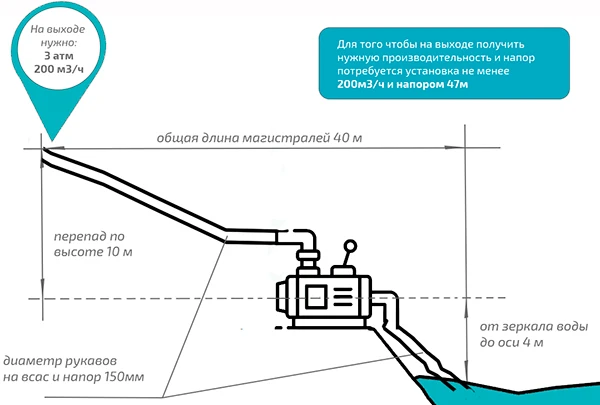 Мотопомпа стоит на краю карьера. От точки забора до насоса — 4 метра. Шланги диаметром 150 мм, их общая длина – 40 м. Высота подъема 10 метров. На точке выброса нужно давление в 3 атм. (1 атм.=10 метров). Перекачивать необходимо до 200 м3 в час.