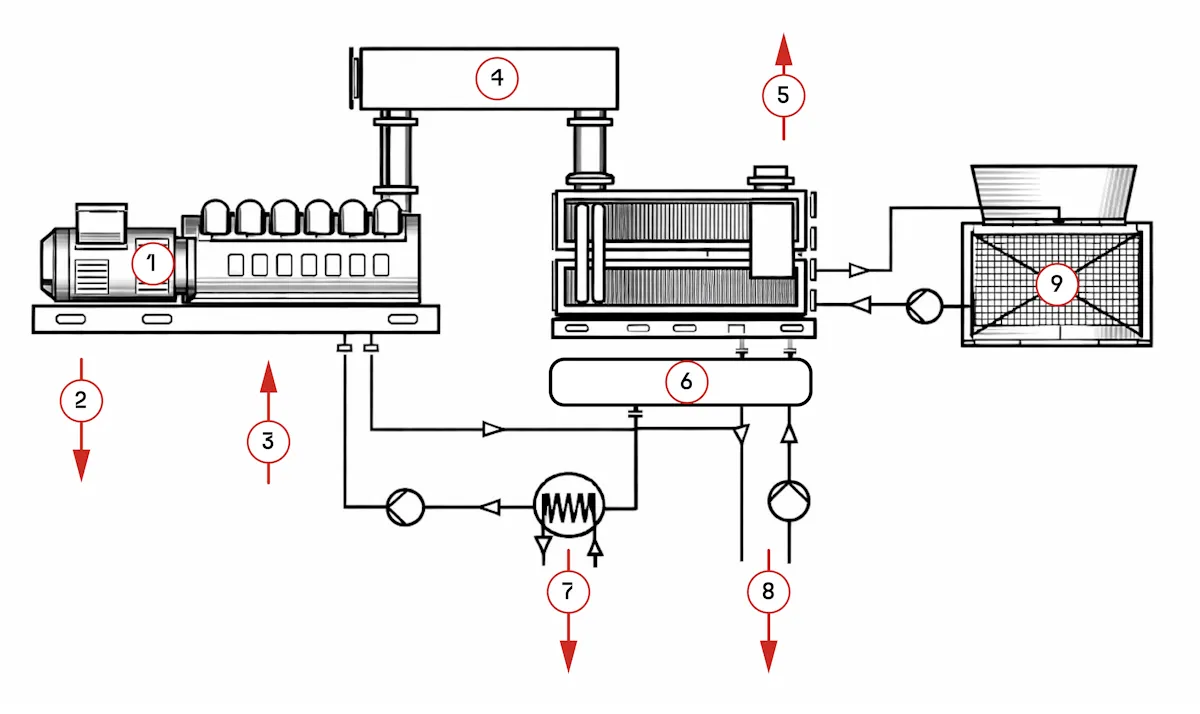 - Система утилизации тепла — теплообменники и котёл-утилизатор, обеспечивающие отбор тепловой энергии от выхлопных газов и контуров охлаждения двигателя.