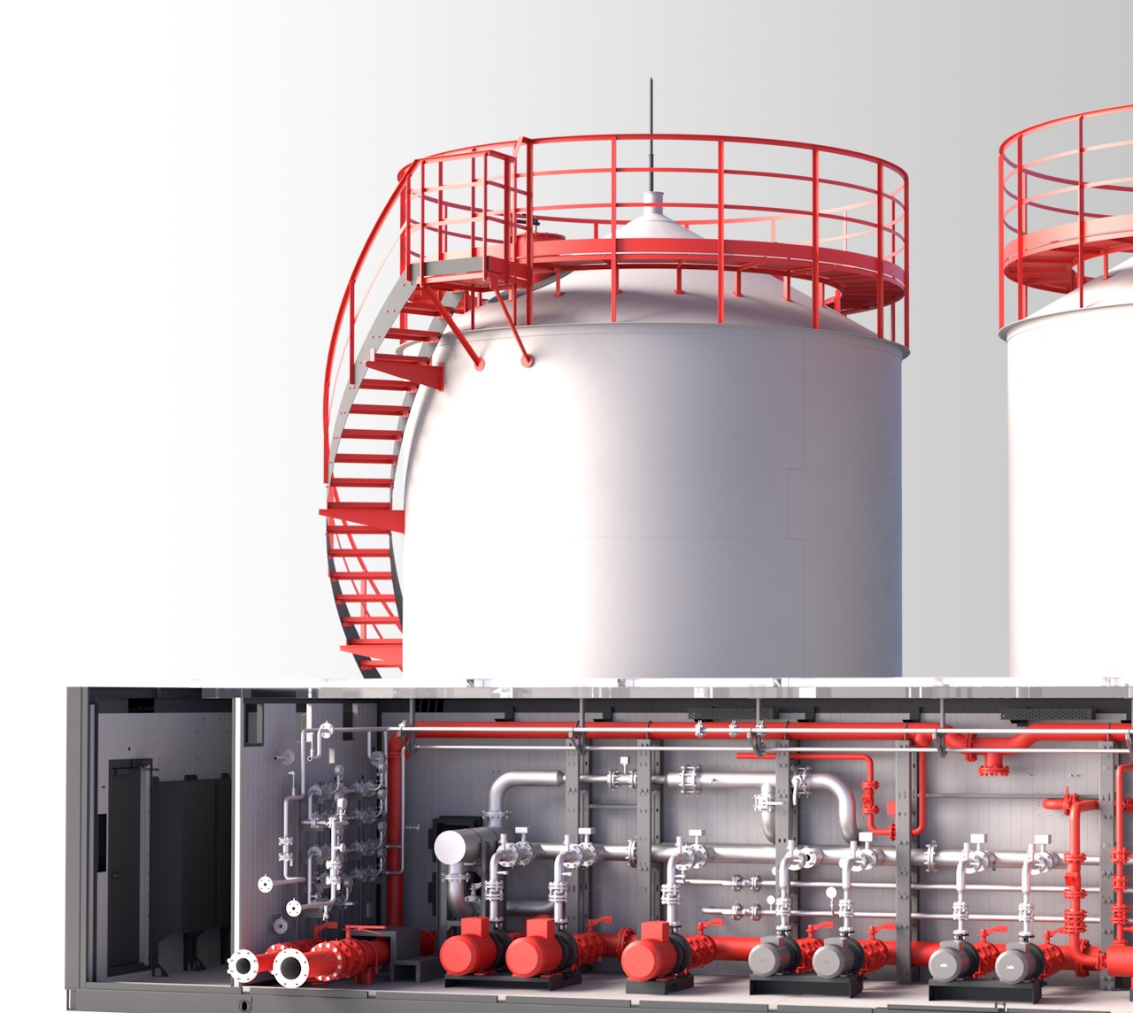 Блочные насосные станции ПСМ могут быть укомплектованы вертикальными стальными резервуарами (РВС) для хранения запаса воды. Это решение актуально для БНС пожаротушения и хозяйственно-питьевого водоснабжения. В этой модификации станция комплектуется дополнительным насосом для заполнения резервуаров и узлом для водяного отопления для их обогрева.