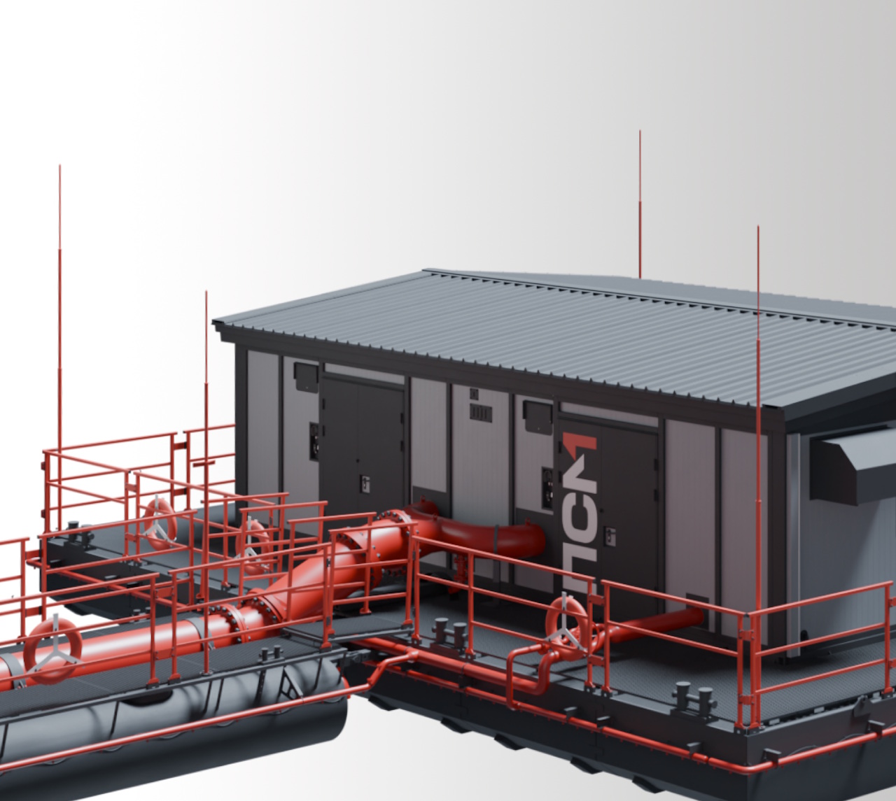 Оборудование плавучей насосной станции монтируется внутри блок-модуля. Конструкция представляет собой модульное здание с металлическим сварным каркасом и обшивкой из листового металла. Внутри блок-модули обшиты трехслойными сэндвич-панелями.
