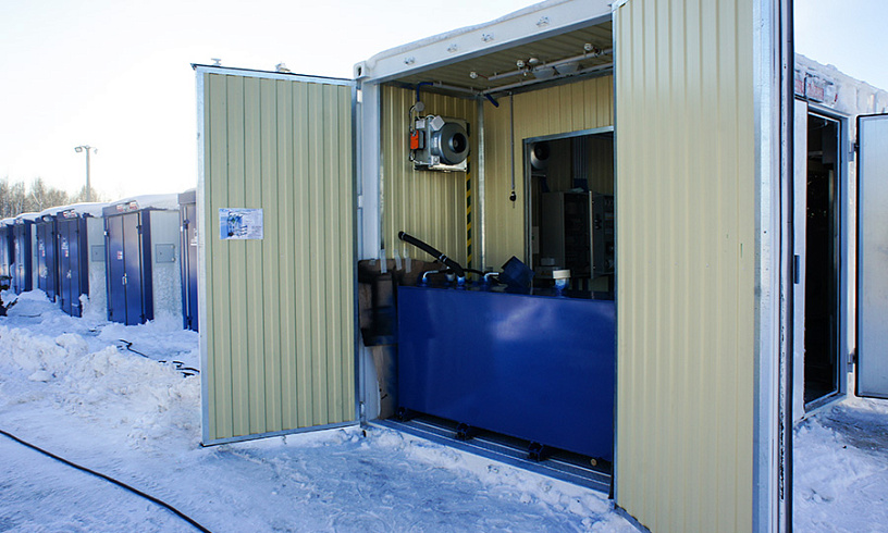 Агрегаты смонтированы в морские контейнеры. Усиленные металлические оболочки полностью защищают оборудование от негативных погодных факторов: мороза, снега, ветра. Термодатчики постоянно следят за климатом внутри, регулируют вентиляцию и обеспечивают электростанциям идеальную атмосферу для работы. Контейнеры также отвечают за противопожарную безопасность. Дыхательный клапан выводит скапливающиеся пары топлива, а автоматическая система контролирует показания датчиков задымленности и готовится мгновенно запустить процесс пожаротушения. В комплекте к каждой ДГУ предусмотрен дополнительный топливный бак объемом 1000 литров. Как только запасы горючего будут исчерпаны – система самостоятельно дозаправит бак. Выходы трубопроводов расположены с наружной части контейнера, поэтому электростанции можно легко соединить с топливохранилищем напрямую. По схожей схеме работает и система автоматической дозаправки маслом.