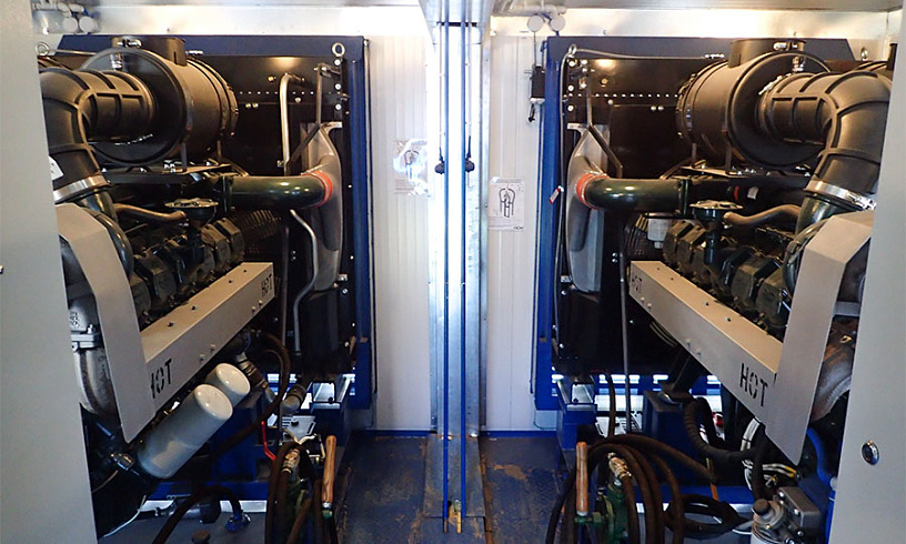 Для защиты станций выбрали нетиповое исполнение – сдвоенный контейнер «Север». Расширенный машинный зал и один топливный бак для двух агрегатов упрощают обслуживание электростанций.