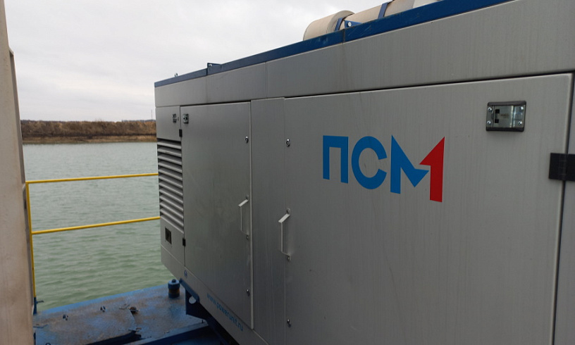 Установка укомплектована насосом для грязной воды. Агрегат стационарный, его установили на берегу ручья. От осадков двигатель защищает капот.