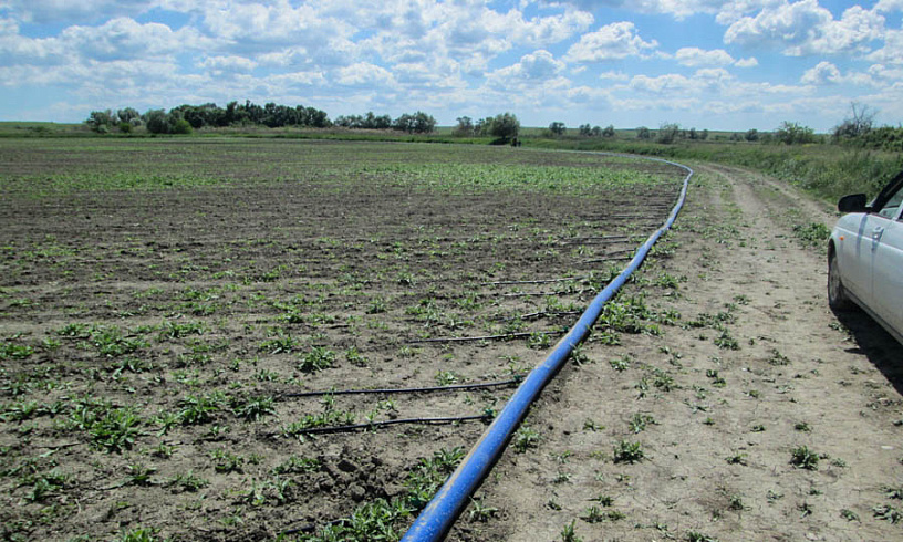 Мотопомпа ПСМ подает воду в систему капельного орошения поля площадью 10 га в селе Урожайном. Аграрии собирают с этих угодий овес, пшеницу, ячмень и другие зерновые культуры для производства мукомольных изделий и различных видов круп.