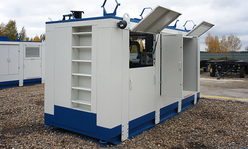 Модель установлена в специальный капот. В нем предусмотрены малейшие детали – крепления для транспортировки напорных и всасывающих магистралей, лестница на крышу капота, удобные сервисные двери, внешнее и внутреннее освещение.