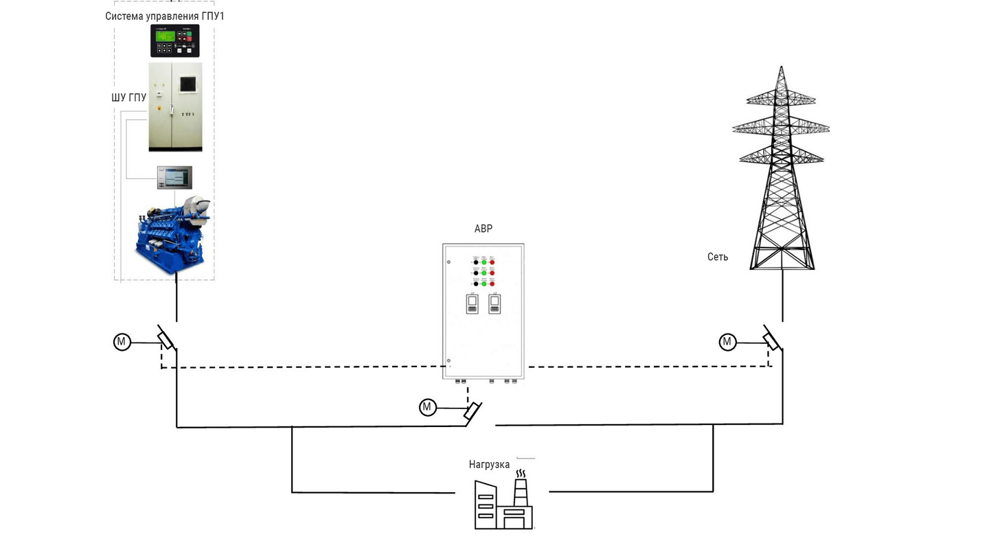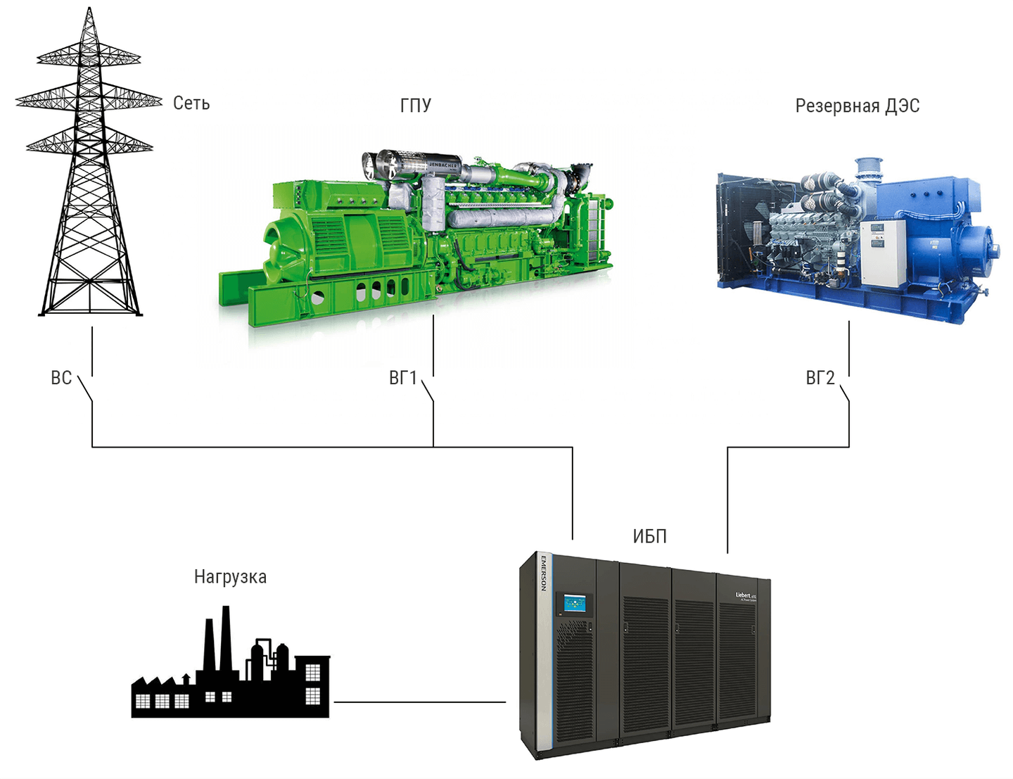 Основной источник – сеть/ГПУ (параллельная работа или островной режим), резервный – ДГУ, ИБП.