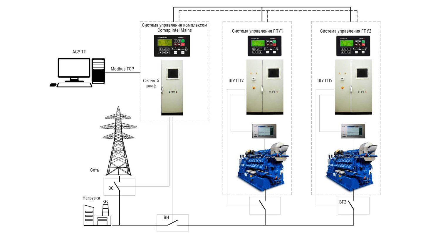 Газопоршневые установки ПСМ и отдельные подсистемы станций оснащены электронными системами управления, что позволяет внедрить ее существующую в АСУ ТП по протоколу Modbus (RS-485), Profibus.