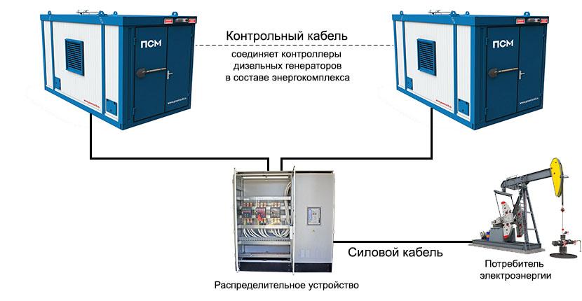 ПСМ предлагает использовать энергокомплексы мощностью 4000 кВт собственного производства. Такие комплексы состоят из нескольких электростанций, работающих параллельно. Нагрузка равномерно распределяется между дизель-генераторами. Энергокомплекс ПСМ в любой момент можно разделить на независимые генераторы и использовать их на разных объектах.